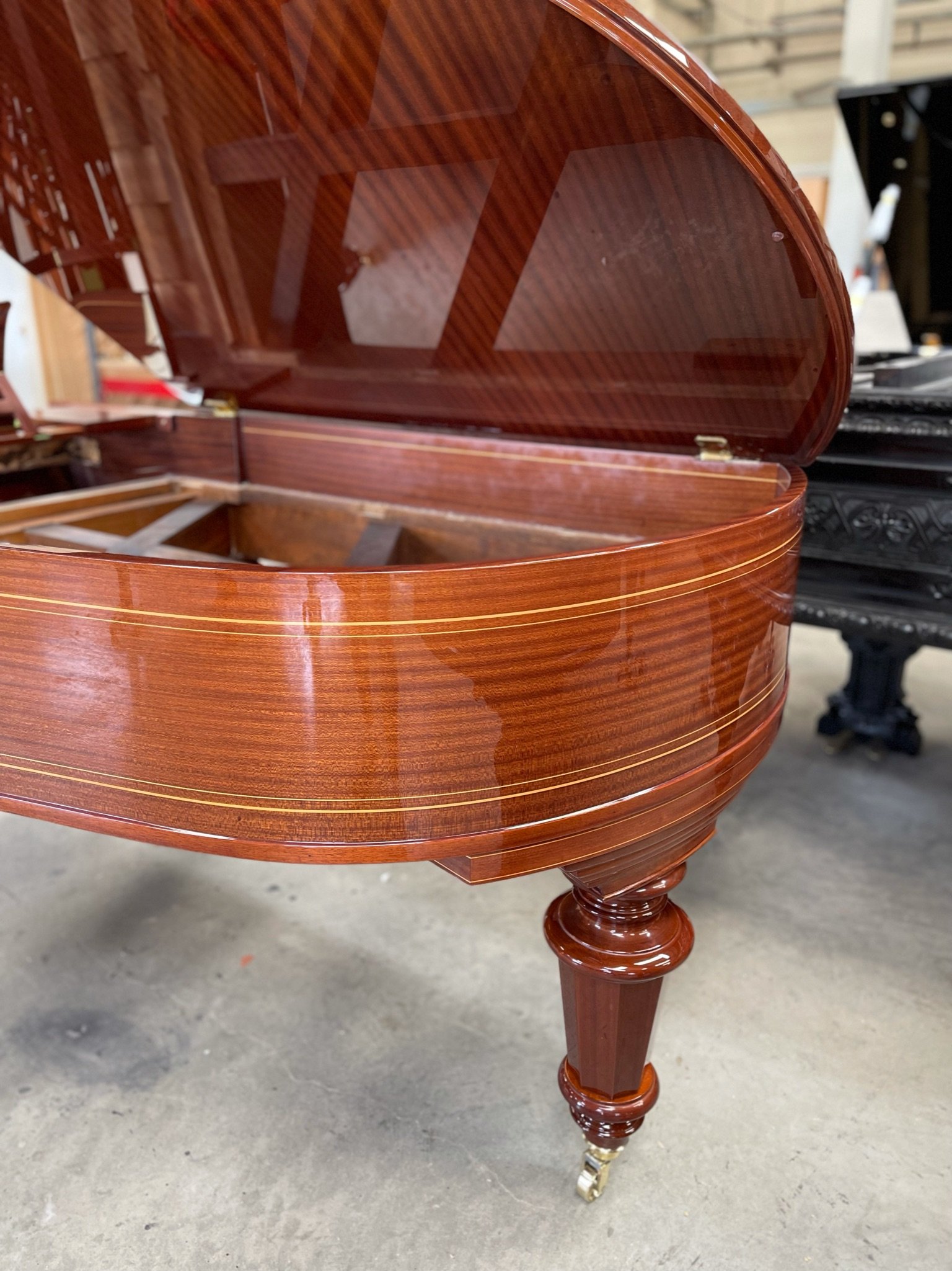 – A high-gloss finish, showcasing the exquisite mahogany veneers enhanced by inlaid boxwood detailing